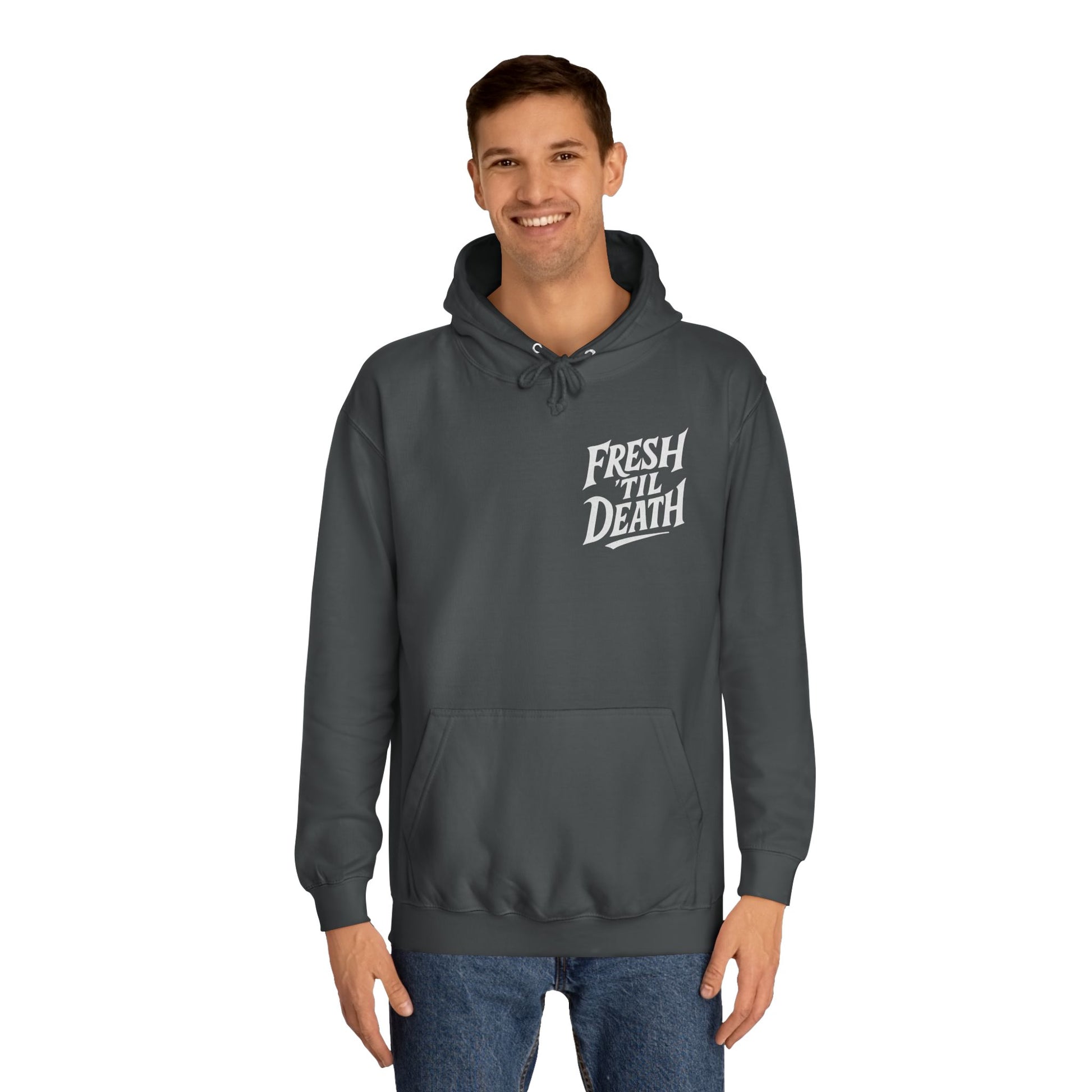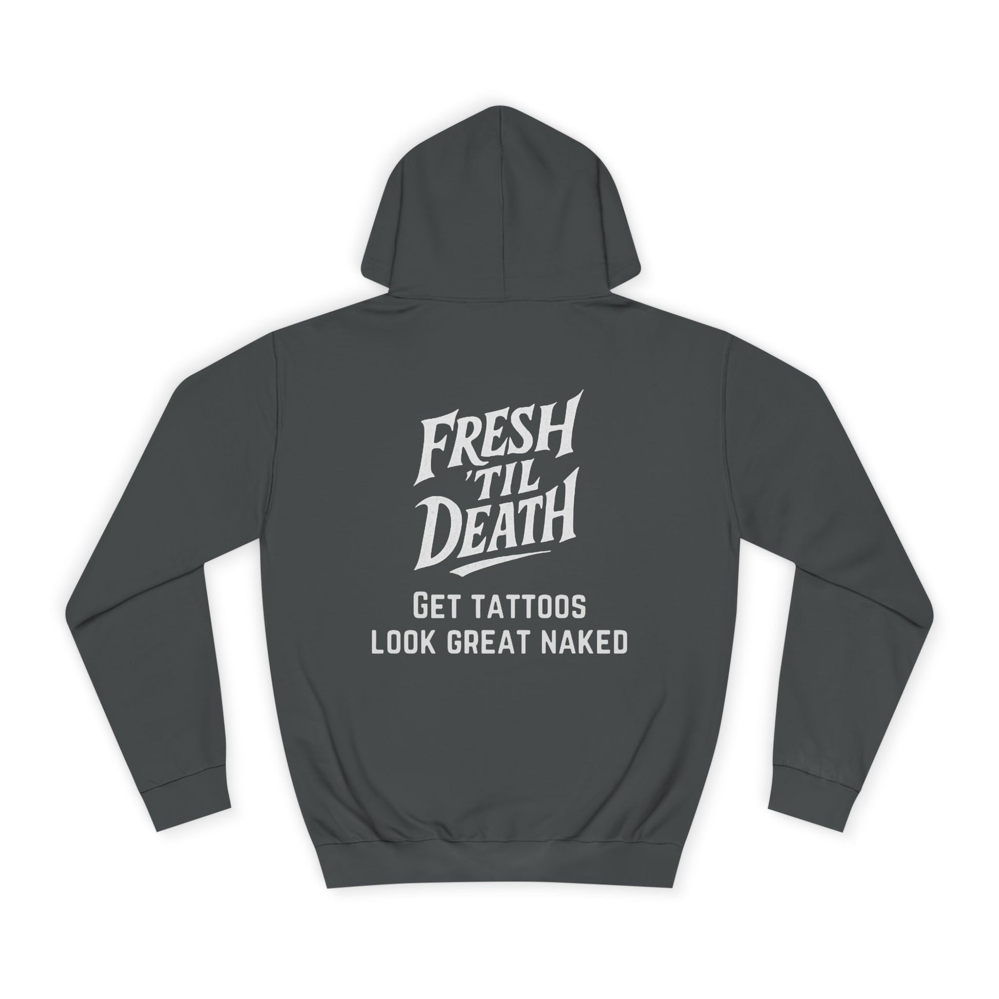 This hoodie carries Midwest tattoo culture in its fibers. It settles like a familiar ritual: the soft weight across your shoulders, the hood pulled up against late-night studio air, the kangaroo pocket steady for warming hands or holding inks and small tools. It’s built to move with you — loose through the body, tough at the seams — and speaks to people who value craft over flash. Wear it after a long session to soothe chilled skin, to sit in the shop and trade stories, or to walk the neighborhood with the quiet confidence of someone who knows their own work and respects others'. The muted, durable fabric and understated construction let brand and lifestyle do the talking without shouting.